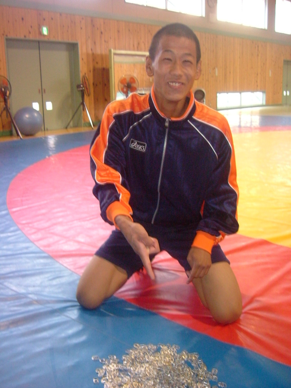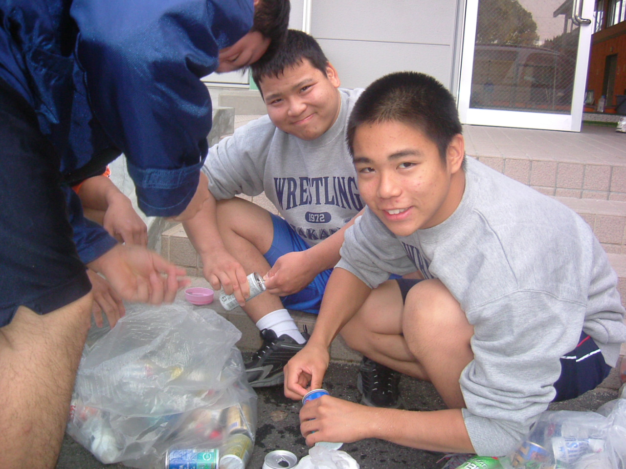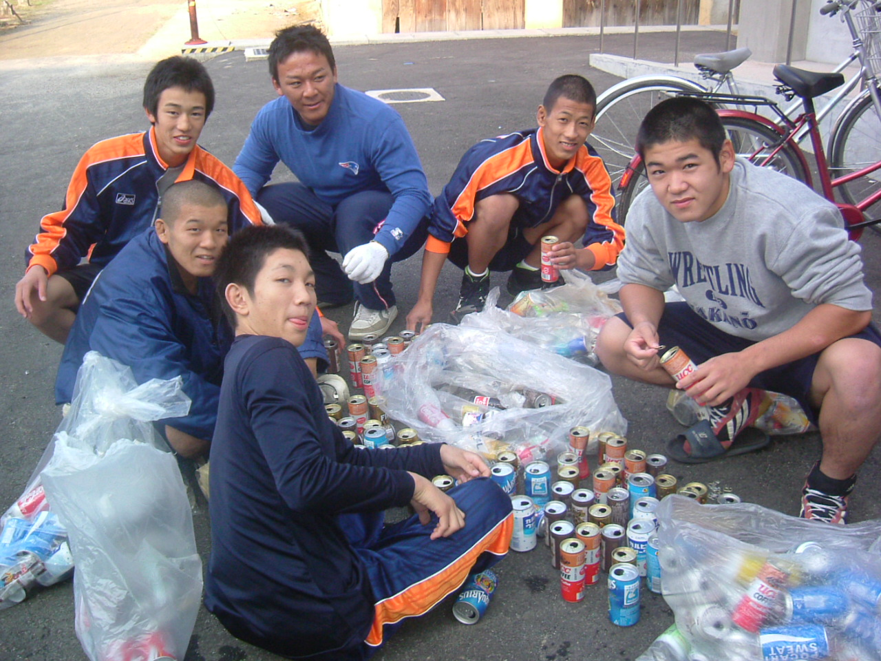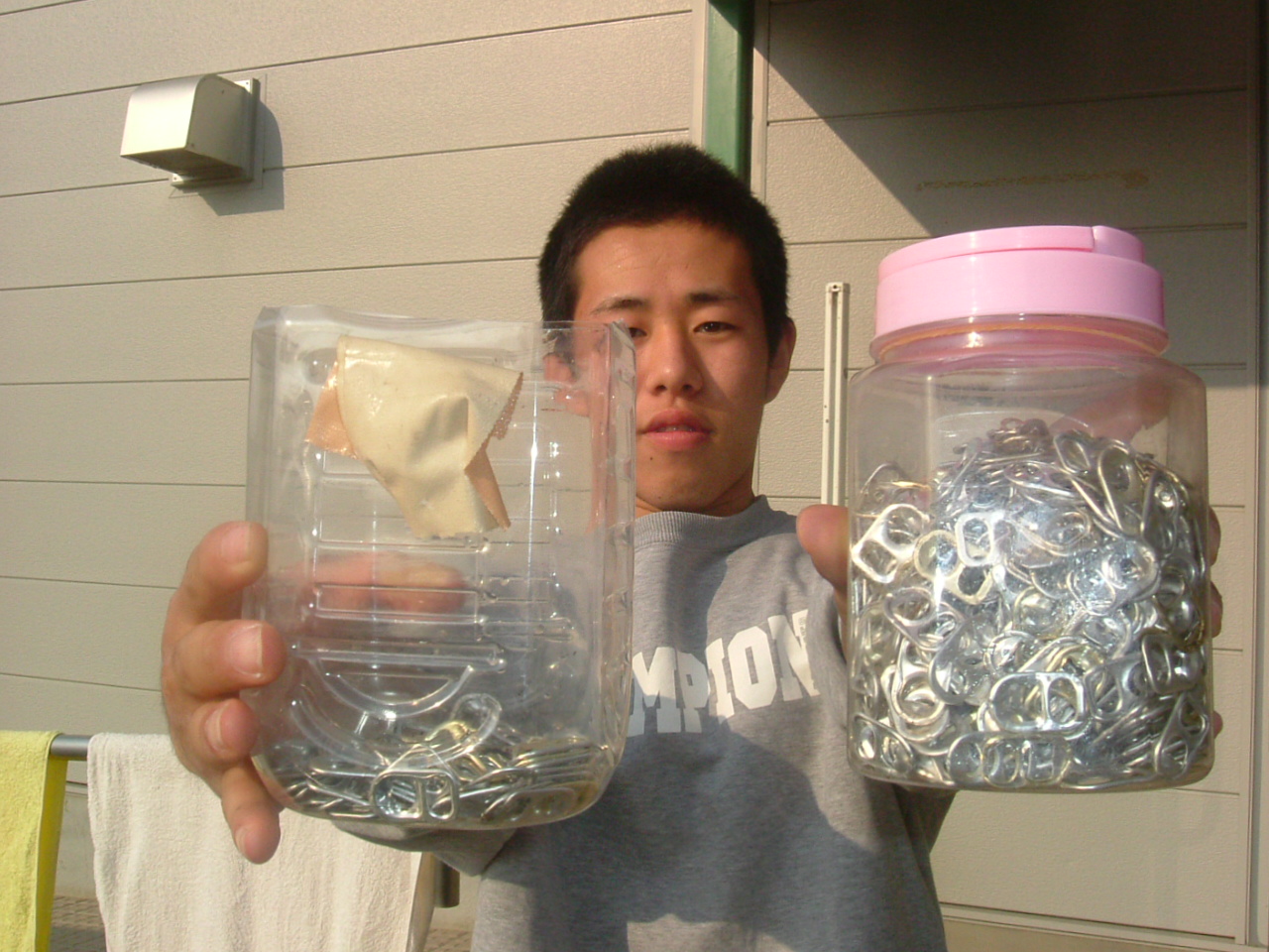 空き缶のプルトップを集めると車イスをプレゼントできると聞きました。誰からともなく少しずつ集めるようになり、 今ではゴミ箱をひっくり返して集めることもあります。部員以外の友達や先生方が集めてくれることもあります。
