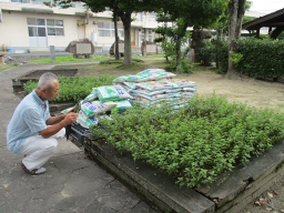 | 平成29年8月17日(水)9:30〜12:00 3年ハーブ班3名は、ドライになっているレモングラスの裁断実習 |