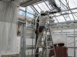 | 外部遮光カーテン工事終了(12月22日) 今後、照明・温風機など電気 関係の工事が入る予定 (南妻面からの写真) |