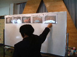 ・右下に見えるように、事前説明が 終わるまで、ホワイトボードで 作製キットを目隠ししておく。 |