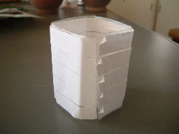 | ・ペットボトルを切り 両面テープを貼っておく。 ・さらにシールが剥がれ やすいようにシールに 折り目を付けておく。 |