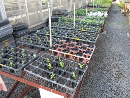 実習室東犬走りで育苗A (一部鉢上げ後、7月3日) |