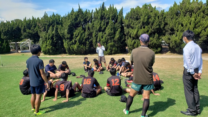 善戦するもなかなか相手ゴールラインに攻め込むことができず、前半・後半それぞれに3トライを奪われ、0-40 で敗戦。相手校の監督は、4年前まで本校でお世話になっていた先生で、感謝の意味からも何とか1トライをあげたかったのですが…残念!