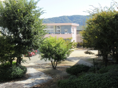 本校のシンボルツリーと言える2本のクスノキ「楠、樟」が左右に見えます。