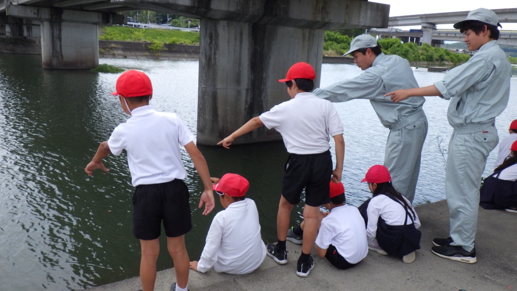 今回は水質生態調査を行いました。生息する水生生物から水質の調査を行いました。児童たちも高校生と共にとても楽しそうに学習していました。