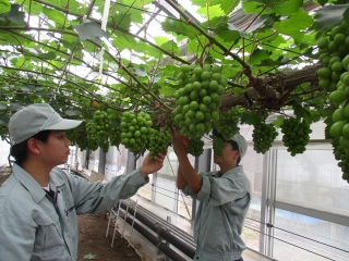 「実施目的と作業のポイント」粒が大きくなり、粒同士がぶつかると粒が壊れてしまいます。適度の間隔をあけて、最高の形状のブドウ房にしてお客様にお届けできるように取り組んでいます。房の最終的な形状をイメージしながら一粒一粒間引いていきます。
