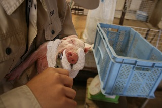 子豚は生まれてすぐに体重を計ったり、犬歯を切ったり、雌雄の確認、へその緒の消毒などをします。その後子豚に初乳(子豚が元気に育つために必要な栄養分が含まれている)を飲んでいるのを確認します。
