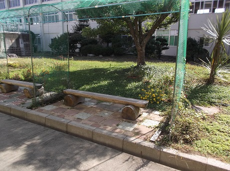 3Hの教室の前のベンチです。ベンチの周りにはセンニチコウなど様々な花が植えられおり、毎日癒されています。