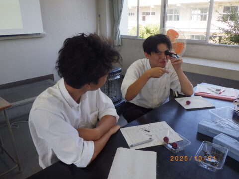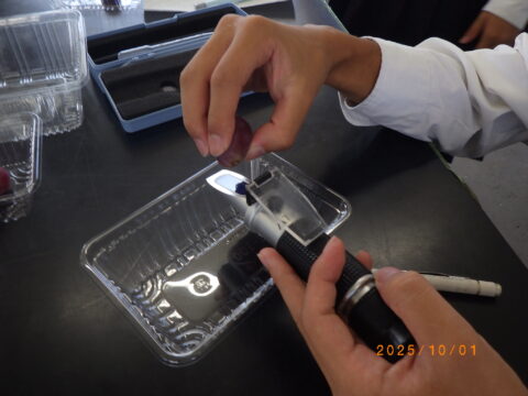 この日は園芸科学科2年生が「果樹」の授業でブドウの糖度測定を行いました。