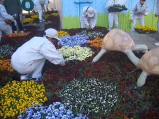 また、草花装飾は、カメのオブジェを設置したときに「花畑の中でカメがのんびりしている様子」を表現し、見る人に「楽しそう、可愛い」といった雰囲気が伝わるように考えながらビオラ苗2016ポットを使って準備しました。