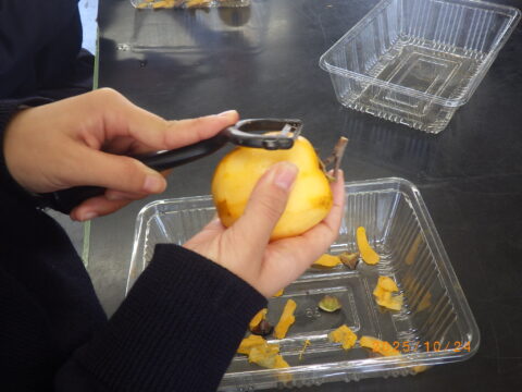 今年は果樹園の渋柿が豊作ということもあり、「果樹」の授業を利用して全員で干し柿を作ることにしました。手を切らないよう気をつけながらピーラーを使って3個の「西条柿」の皮をむきます。