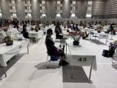 この大会は、全国の専門高校で学ぶ高校生が、指定された花材、資材、花器を使用し、制限時間60分で与えられたテーマに基づいて自由に作品を制作し、その技術や芸術性を競います。今年は「届けたい想い」というテーマのもと全国各県から集った63名の選手がデザイン制作に臨みました。二人も大会直前まで放課後や休日も練習に取り組み、万全の状態で大会に臨みました。