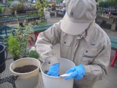 今年も草花専攻生23年生が、本校近隣の農マル園芸吉備路店で開催されたイベント「寄植え甲子園」に参加してきました。このイベントは、2500円の予算内で寄植えに使用する花材を自由に選び、それを用いて寄植えをつくり、その出来を一般のお客さんの投票や店舗スタッフさん等に評価してもらうものです。14回目の開催となった今回は、「パンジー、ビオラ使って秋・冬を彩る」という課題でした。毎年県内の農業関係高校から100名前後の参加者があるようで、園芸科学科からも3年生12名と2年生11名が寄植えに挑戦しました。会場では最初に説明をうけ、その後必要な花材の数や種類、デザインなどを考えました。制作するデザインが決まったら、花材選びになります。みな思い思いの花苗を慎重に選んでいました。花材選びが終わったらいよいよ制作です。1時間の制限時間の中、デザインを考えなが花苗を配置して植えていきます。植えた後も全体のバランスや見る角度を変えて自分が思い描いた通りの寄植えになっているかチェックして完成となります。皆それぞれの個性のあるデザインの作品が出来上がっていました。今後はお店に展示され、お客さんの投票等によって作品が評価されます。結果が楽しみです。