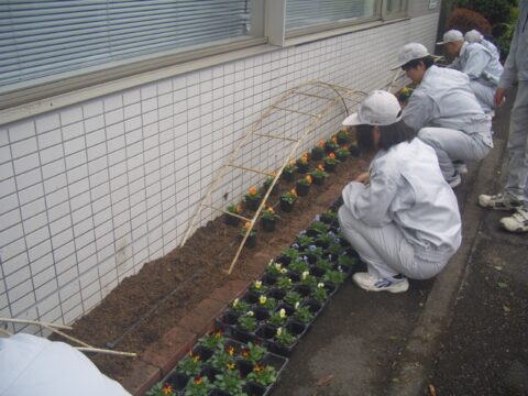 持ってきた花苗の配色を考えながら植えていきます。その後肥料をやり最後に水やりをして完成となります。花壇の草花が更新され、見た目も鮮やかになりました。作業は1時間ほどで完成し、日々の実習の成果を確認できるよい機会となりました。