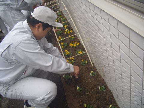 岡山市西河原の弘済会に2年生の草花専攻生7名が植栽実習に行ってきました。この日は、建物の外にある約15m程の花壇を学校で育てたビオラの花苗とプランターを持ち込んできれいに装飾しました。