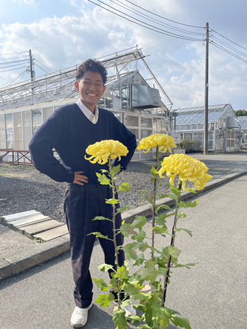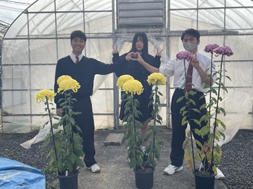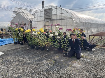 今年度も一年生が「農業と環境」の授業で育てているキクが開花しました。例年より少し遅れての開花になりましたが、生徒は相互に品評を行うことで「良い花」への理解を深めました。6月の挿し芽から大事に育てたキクの姿にとても喜んでいました!