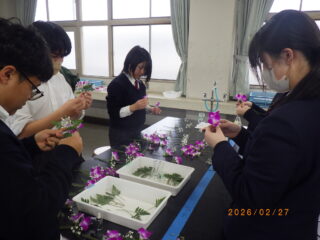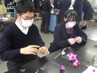 園芸科学科では毎年、卒業式に卒業生が身につけるコサージュを制作しています。今年も卒業式の前日に園芸科学科2年生と1年生の草花専攻生がコサージュの作りに挑みました。