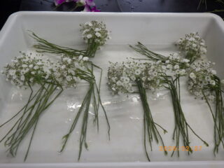 この日は5人程のグループを作り、グループ単位で決まった数のコサージュを作りました。最初に基本材料の制作を行います。1つのコサージュには、デンファレが2輪、カスミソウ4枝、レザーファン3枚を1セットとして使うため、まずそれぞれの部材の下準備を行いました。これだけでもかなりの時間を必要としましたが、皆和気あいあいとした雰囲気で作っていました。
